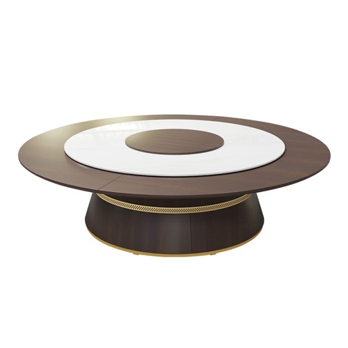 酒店包房實(shí)木電動(dòng)大圓桌帶轉盤(pán)自動(dòng)旋轉餐桌臺面是實(shí)木桌面與巖板轉盤(pán)組成,